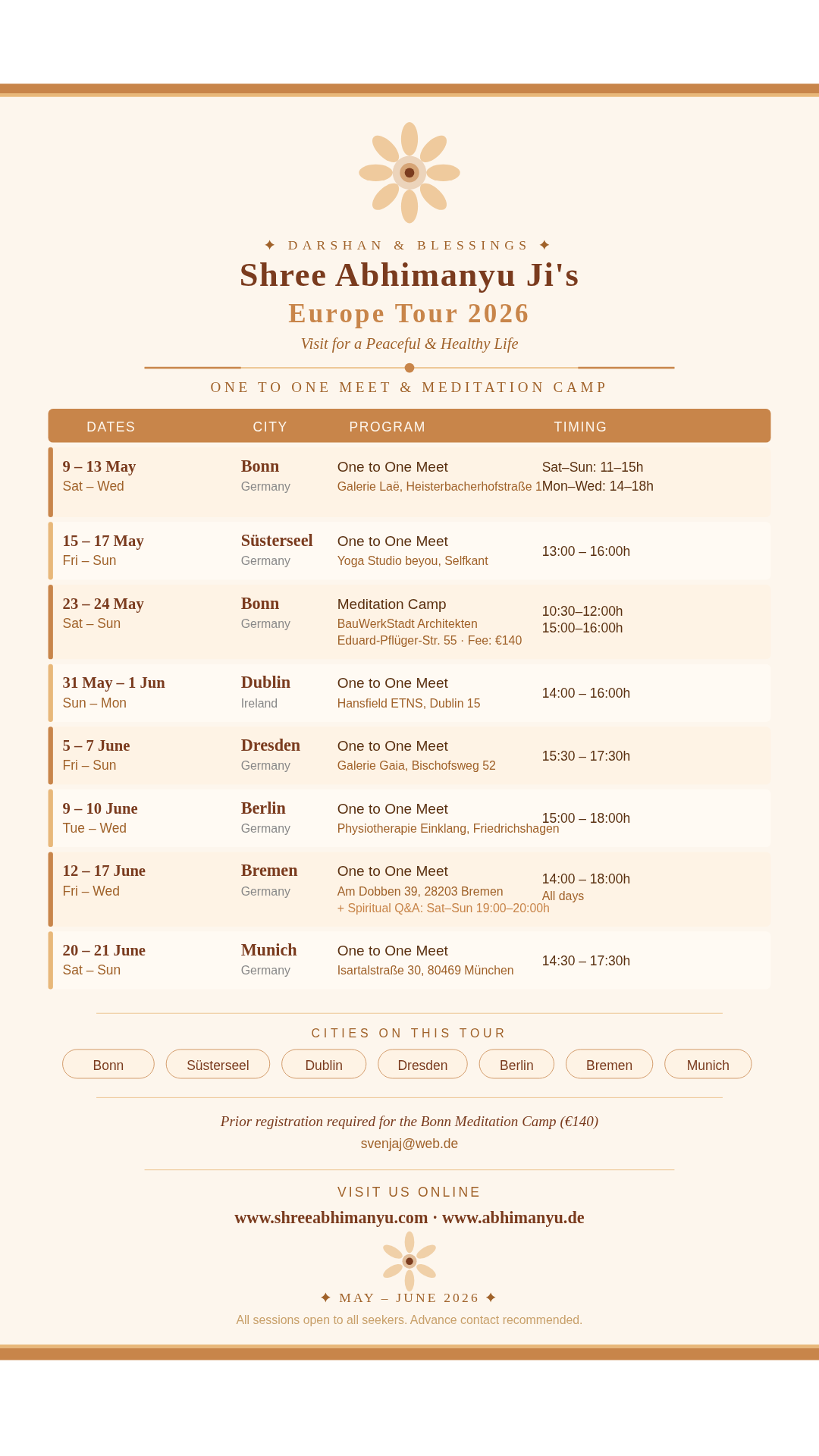 *Europe Schedule 2026 (May–June)* *Bonn – Camp* 📅 9–13 May (Sat–Wed) ⏰ Sat–Sun: 11:00–15:00 ⏰ Mon–Wed: 14:00–18:00 📍 Galerie Laë, Heisterbacherhofstraße 1, 53111 Bonn 👥 Organisers: Diana, Heidrun, Svenja & Josi 📞 Contact: 01778520592 (17–19h) --- *Süsterseel – Camp* 📅 15–17 May (Fri–Sun) ⏰ 13:00–16:00 📍 Yoga Studio beyou, Selfkant 👥 Organisers: Ilka & Bernd […]