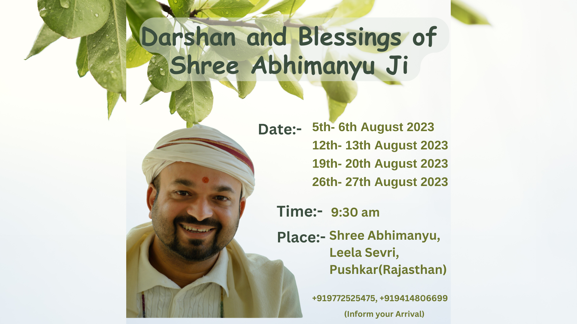 Darshan and Blessings of Shree Abhimanyu Ji Date : 5th- 6th August 2023 12th- 13th August 2023 19th- 20th August 2023 26th- 27th August 2023 Time: 9:30 AM Place : Shree Abhimanyu, Leela Sevri, Pushkar(Rajasthan) +919772525475, +919414806699 (Inform your Arrival) |