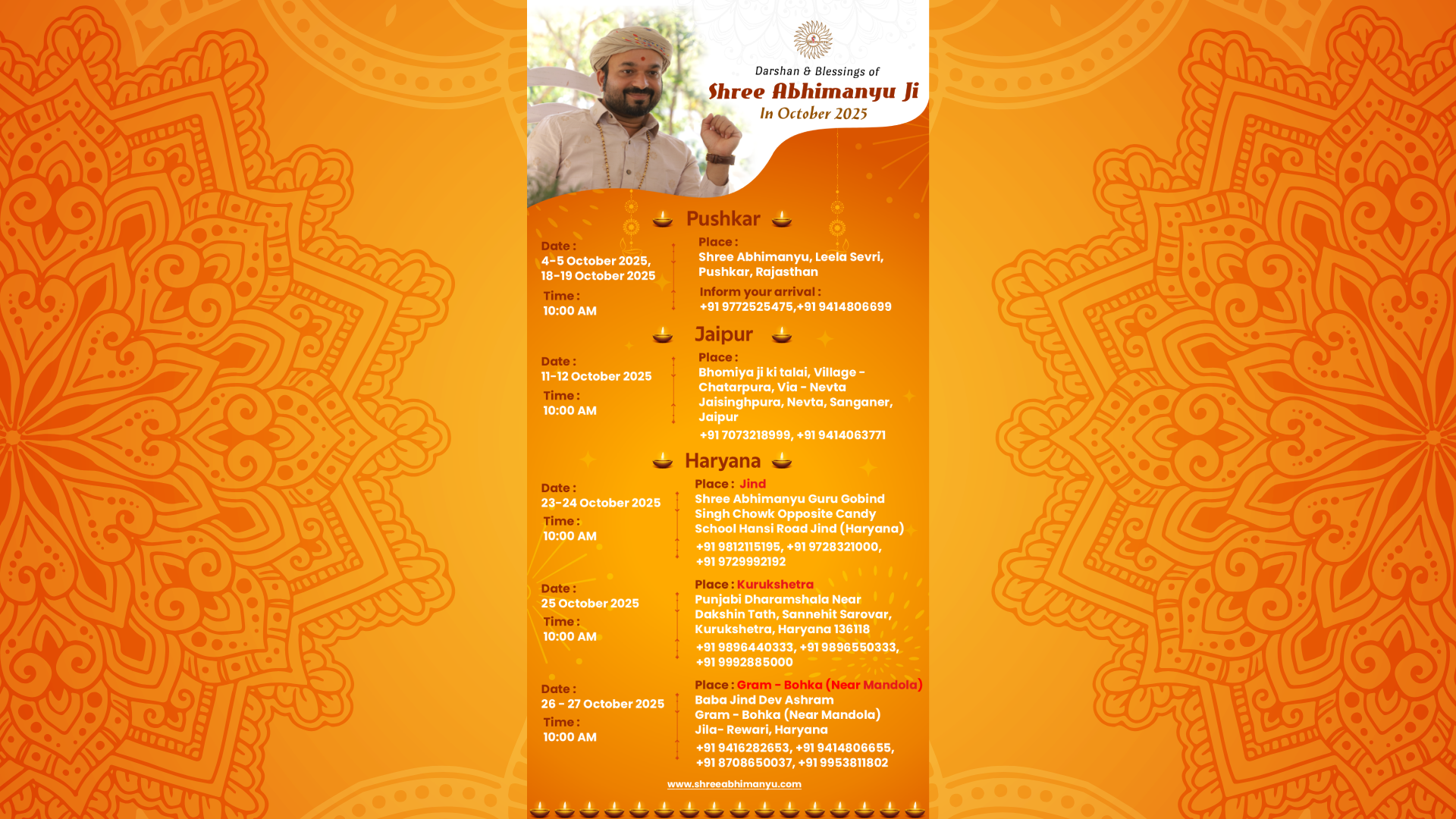 ЁЯУН PUSHKAR ЁЯУЖ 4тАУ5 October 2025 ЁЯУЖ 18тАУ19 October 2025 ЁЯХШ Time: 10:00 AM ЁЯУМ Location: Shree Abhimanyu, Leela Sevri, Pushkar, Rajasthan ЁЯУЮ Inform your arrival: +91 9772525475, +91 9414806699 ЁЯУН JAIPUR ЁЯУЖ 11тАУ12 October 2025 ЁЯХШ Time: 10:00 AM ЁЯУМ Location: Bhomiya ji ki talai, Village - Chatarpura, Via - Nevta Jaisinghpura, Nevta, Sanganer, […]