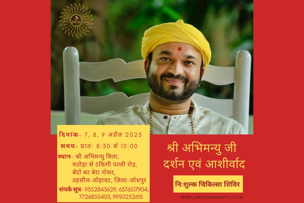 Darshan and Blessings of Shree Abhimanyu Ji in Sirohi, Rajasthan Pindwara Date:- 1st September 2023 (Friday) Time:- 10:00 am Place :- 2/19 , Shree Abhimanyu, Shree Mohan Vihar Housing Board, at- Post - Pindwara, District- Sirohi, Rajasthan (307022) Contact numbers:- 9636266696, 9460171622, 8385926305, 9116499337 Abu-road Date:- 2nd and 3rd September 2023 (Saturday-Sunday ) Time:- […]